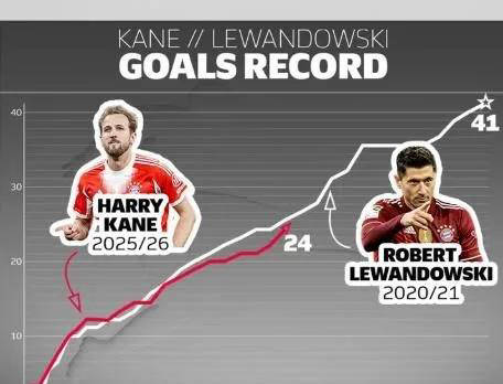 本场比赛的双响还让凯恩迈入另一重要里程碑——五大联赛进球突破300球大关。目前,他在五大联赛累计拿下301球,成为历史上第九位达成此目标的超级射手。纵观排在他前面的伟大名字,像梅西(496球)、C罗(495球)、莱万多夫斯基(391球)等巨星,无疑彰显了凯恩这一成就的非凡价值。而且凯恩的进球效率尤为恐怖:他只用了405场比赛就达到这一数字,场均0.74球。在英超,他320场斩获213球;转战德甲后,更是大爆发,85场轰入88球,效率明显提升。本赛季德甲已攻入24球,稳居射手榜榜首。对比莱万2020/21赛季创纪录的单赛季41球神迹,凯恩22轮打入26球,比当年同期的莱万还高1球。此外,本赛季他的进球转化率高达30.6%,射正率78.1%,两项数据均超过莱万同期创纪录时的29.9%和58.6%。这足以表明凯恩目前的表现已达到甚至超越历史巅峰水平。